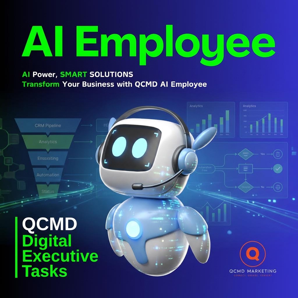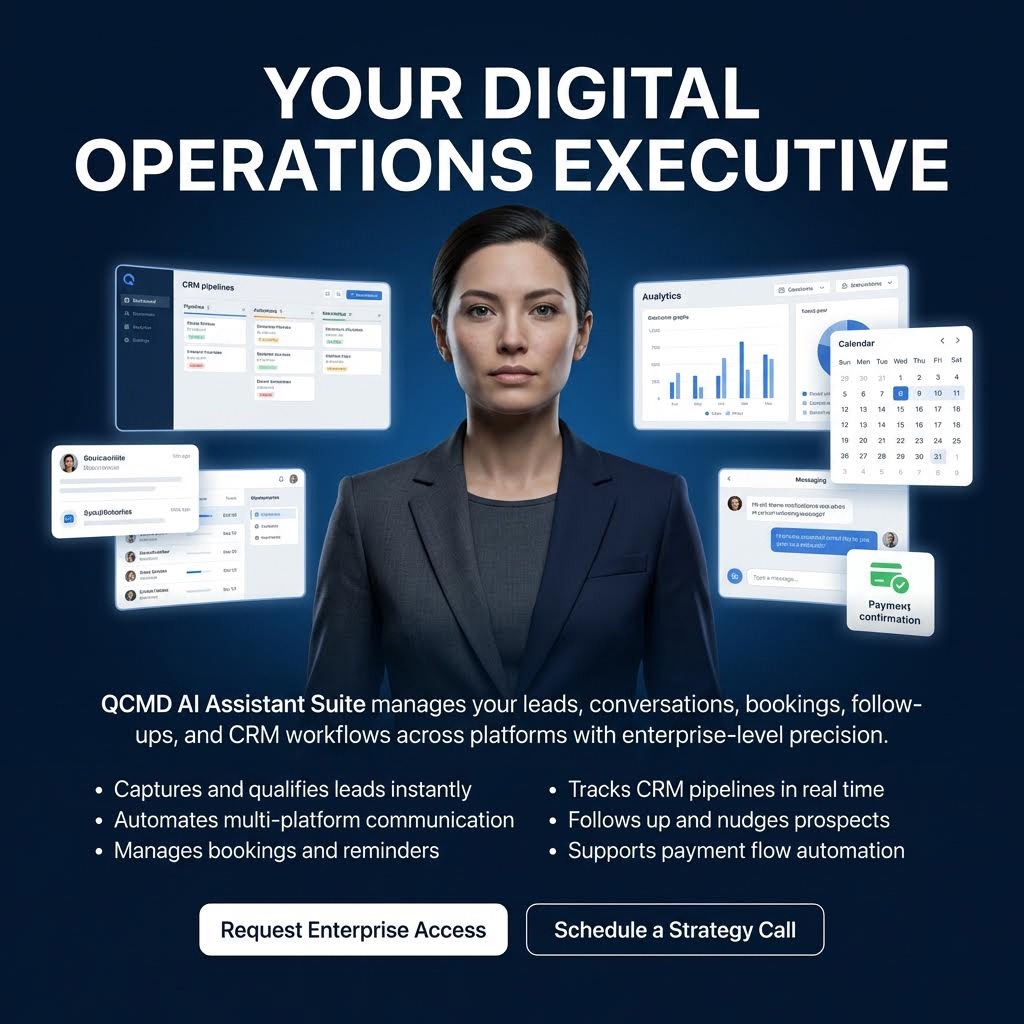 QCMD AI Assistant Suite is your Digital Operations Executive in action. The image represents a live AI system managing your CRM pipelines, conversations, bookings, follow-ups, analytics, and payment confirmations in real time.